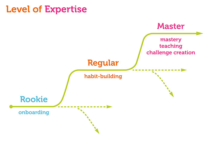 برنامه ریزی برای خستگی بازیگران بسیار مهم است و می بایست در نسخه های جدیدتر خلاقیت و قابلیت های جذاب دیگری به طرح خود اضافه کنیم تا از خستگی کاربران جلوگیری شود. یکی از راه ها این است که همه قابلیت ها را به یکباره در سیستم خود نداشته باشیم و بر اساس پیشرفت بازیگر، قسمت به قسمت آن ها را در اختیار او بگذاریم. Amy Jo Kim چرخه عمر بازیگران را به صورت زیر تشریح کرده است: